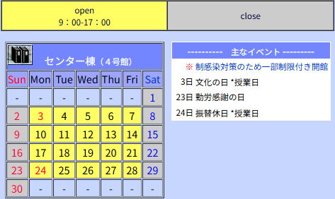 |  | 学外利用者の利用(館内での閲覧のみ)を再開しています。 ◆学術研究・教育・学習のための利用に限ります. ◆利用を希望される場合は来館前に電話・メールにてご連絡ください. ◆入館時は、免許証など氏名等を確認できるものを持参の上、カウンターに申し出て所定の手続きを行なってください。 | |||||||||||||